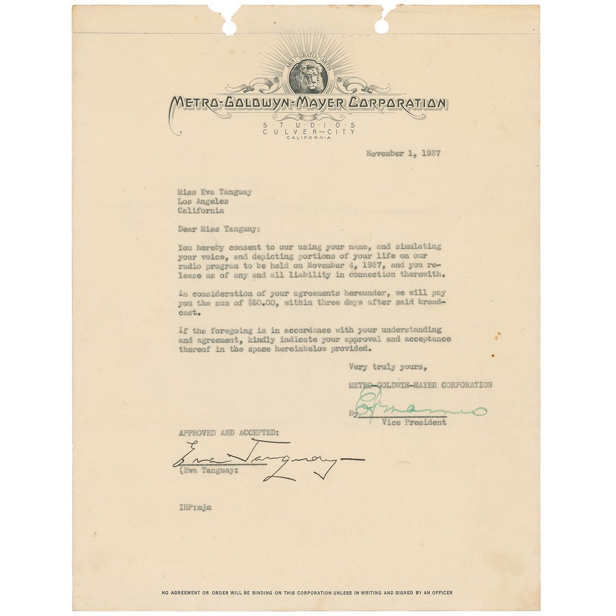 DS, one page, 8.5 x 11, November 1, 1937. Metro-Goldyn-Mayer sends a request to Tanguay for the use of her “name. and simulating your voice, and depicting portions of your life on our radio programs to be held on November 4, 1937, and you release us of any and all liability in connection therewith,” and agrees to provide the actress with compensation in the amount of $50.00. Tanguay signs in her unique hand at the conclusion, below the green fountain pen signature of MGM Vice President, Eddie Mannix. Four horizontal folds, scattered light creasing, some trivial spotting and toning, and two punch holes to the top that have both been slightly torn, otherwise fine condition.