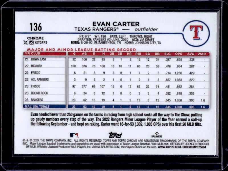 Evan Carter Xfractor Rookie Card 2024 Topps Chrome #136