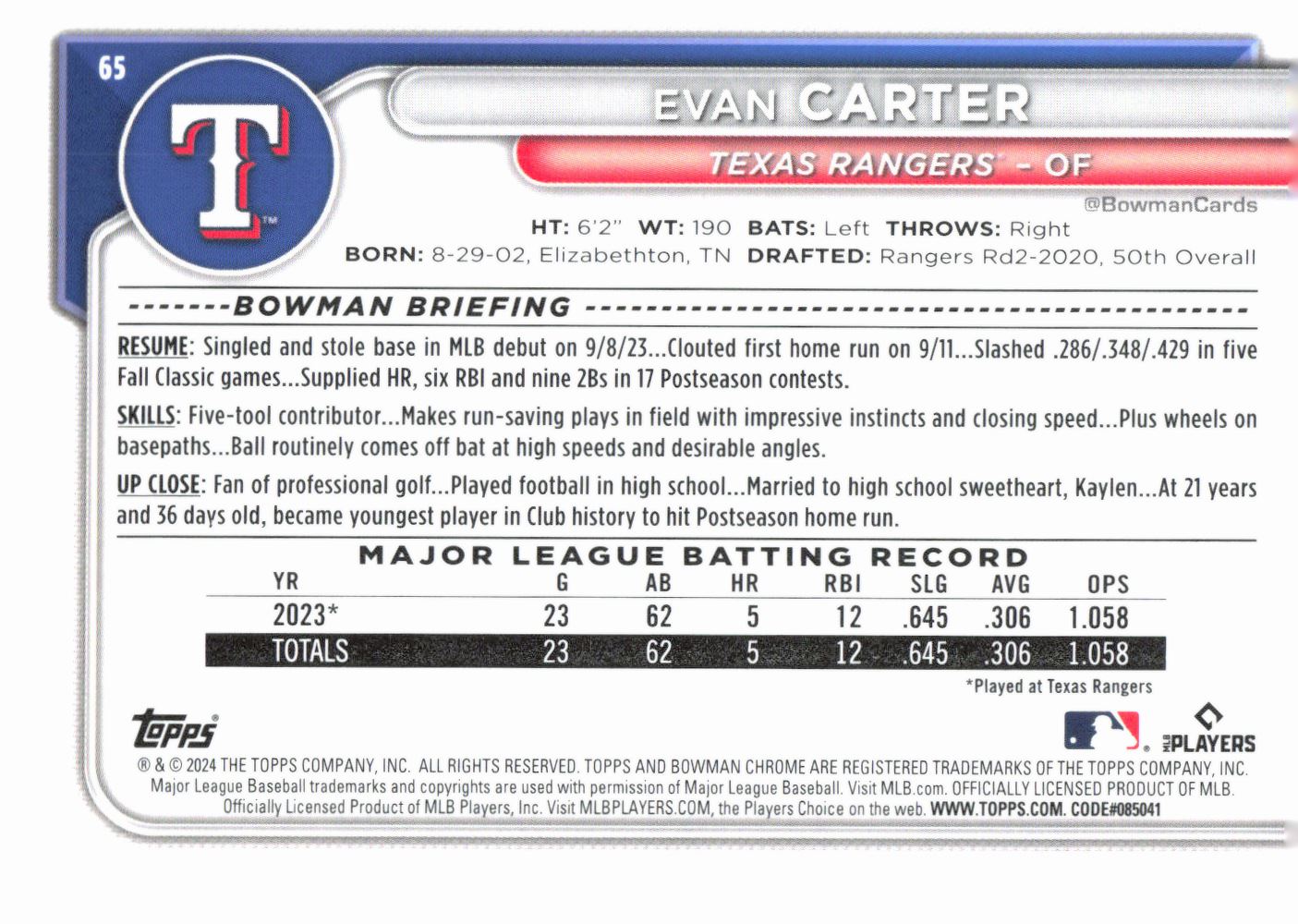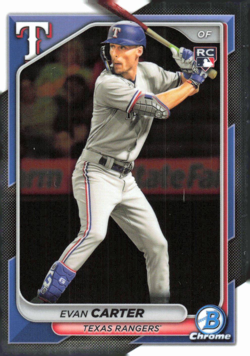 Evan Carter rookie card Bowman Chrome, TX Rangers.