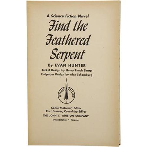 <B>Evan Hunter. </B></I><B><I>Find the Feathered Serpent</B></I></B></I><B>.</B></I> Philadelphia: The John C. Winston Company, 1952.<BR><BR>First edition. Octavo. 207 pages. Jacket illustration by Henry Sharp.<BR><BR>Original brick red cloth with black titles on the spine. Light shelf wear. Internal contents toned, especially at the edges of the pages which is usual for this publisher. Price-clipped dust jacket is shelf worn at the corners and head and foot of the spine. White areas of back panel are lightly soiled. A very good copy of a book rarely encountered in collectible condition, from the author best known under his pseudonym Ed McBain. <I>From the Robert and Diane Yaspan Collection.</B></I><BR><BR><b>Shipping:</b> Books & Catalogs (<a target="_blank" href="http://www.heritageauctions.com/common/shipping.php">view shipping information</a>)