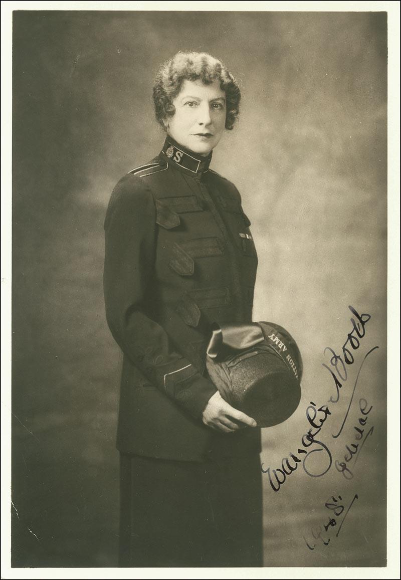 Daughter of William Booth, founder of the Salvation Army, she led the organization from 1934 until her death. Vintage matte-finish 4.5 x 6.5 photo of Booth in her Salvation Army uniform, signed in fountain pen, “Evangeline Booth, General, 1948.” In fine condition, with a couple light creases along left edge. Provenance: The Barry Hoffman Collection.