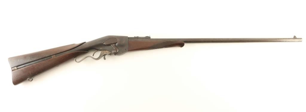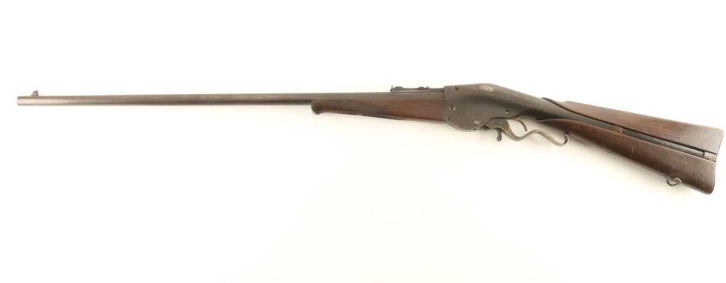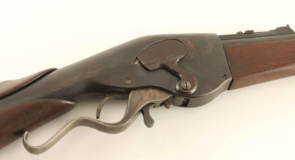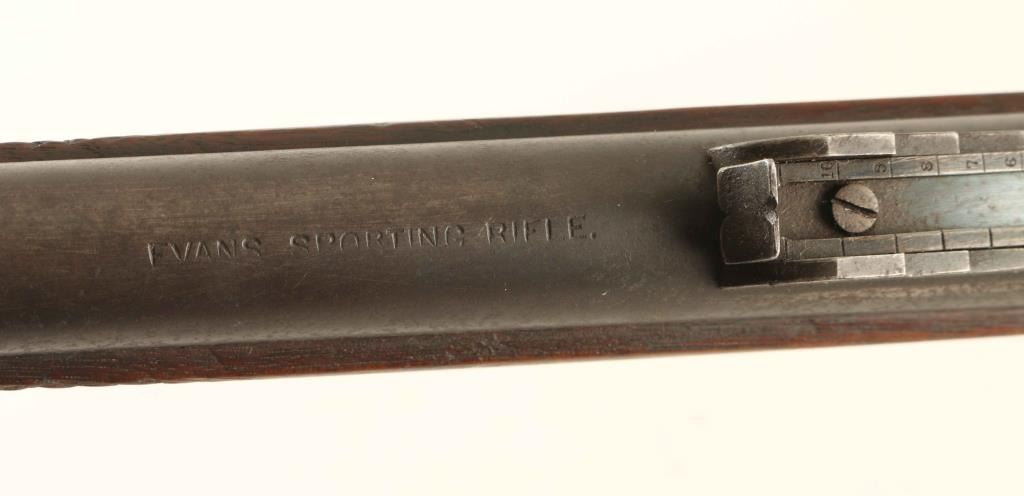 'New Model' Antique American made high capacity lever action repeating rifle chambered in .44 Evans Long, manufactured circa 1870's-1880's. The barrel is stamped "EVANS SPORTING RIFLE." rather than the typical two line address which many believe is an indication that the rifle was assembled by one of the two firms that bought out the remaining inventory when Evans entered bankruptcy in 1879. Rifle features a blued finish, 30" barrel, blade front sight, flip-up ladder style rear sight graduated to 1,100 yards, smooth trigger, case hardened lever, manual safety, dust cover, 28 round helical magazine, checkered walnut forend, two-piece smooth walnut butt stock with sling swivel on the lower portion, and metal buttplate with loading port. Rifle exhibits some nice case colors and approximately 18% of it's thinned blued finish with the balance of the metal surfaces drifted to a pleasant aged brown patina. Action is smooth, the bore is very good with a spot or dark rust and the wood stocks are near fine. Condition is NRA Very Good+. ***Antique Firearm***