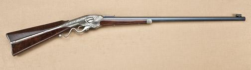 Evans lever-action repeating rifle, .44 Evans centerfire caliber, transition model with Mechanic Falls address, fully and finely period or factory scroll engraved in Nimschke style with the name James Barbour engraved in banner incorporated into scrolls on left side of frame, blue and nickel finish, select burl wood stocks, serial #674. The name James Barbour is believed to be James Barbour of Virginia, prominent American lawyer, planter, delegate from Virginia to the Democratic Nationa Convention, delegate to the Virginia Secession Convention and Major in the Confederate States Army in the Civil War. After the war, Mr. Barbour obtained interested in the Richmond Dailey Enquirer and Examiner and became their editor. In 1885 he ran for the Virginia house of delegates and served until 1888 when he retired. He died October 29, 1895 at Clover Hill in Jeffersonton, Culpepper County Virginia. The rifle retains 95% of its bright original blue on the barrel, just some slight beginning age. The frame, forend cap, magazine tube, and butt, show 90-95% original uncleaned satin nickel finish with a light coating of dried oil, some slight losses, mostly on the butt. The varnish wood stocks are fine to near
