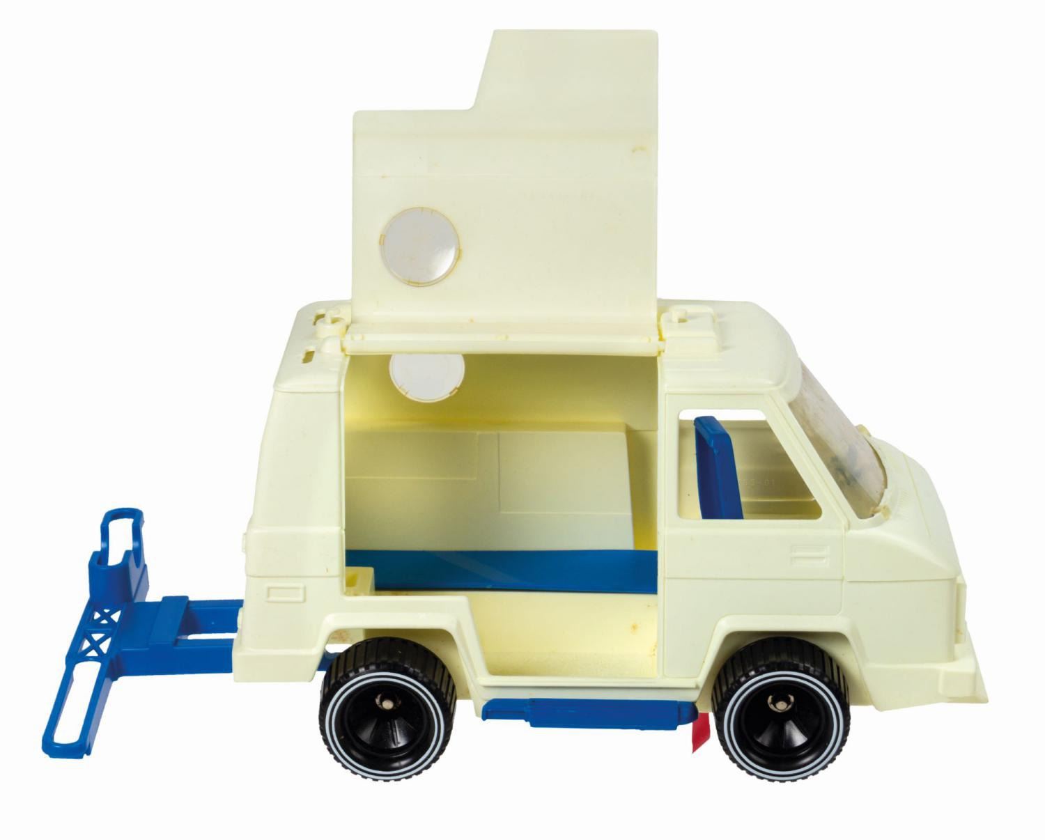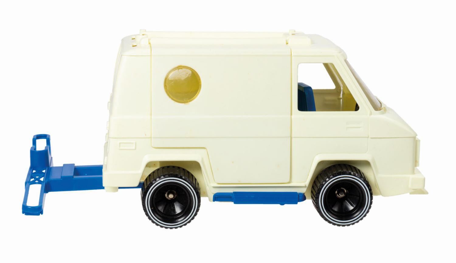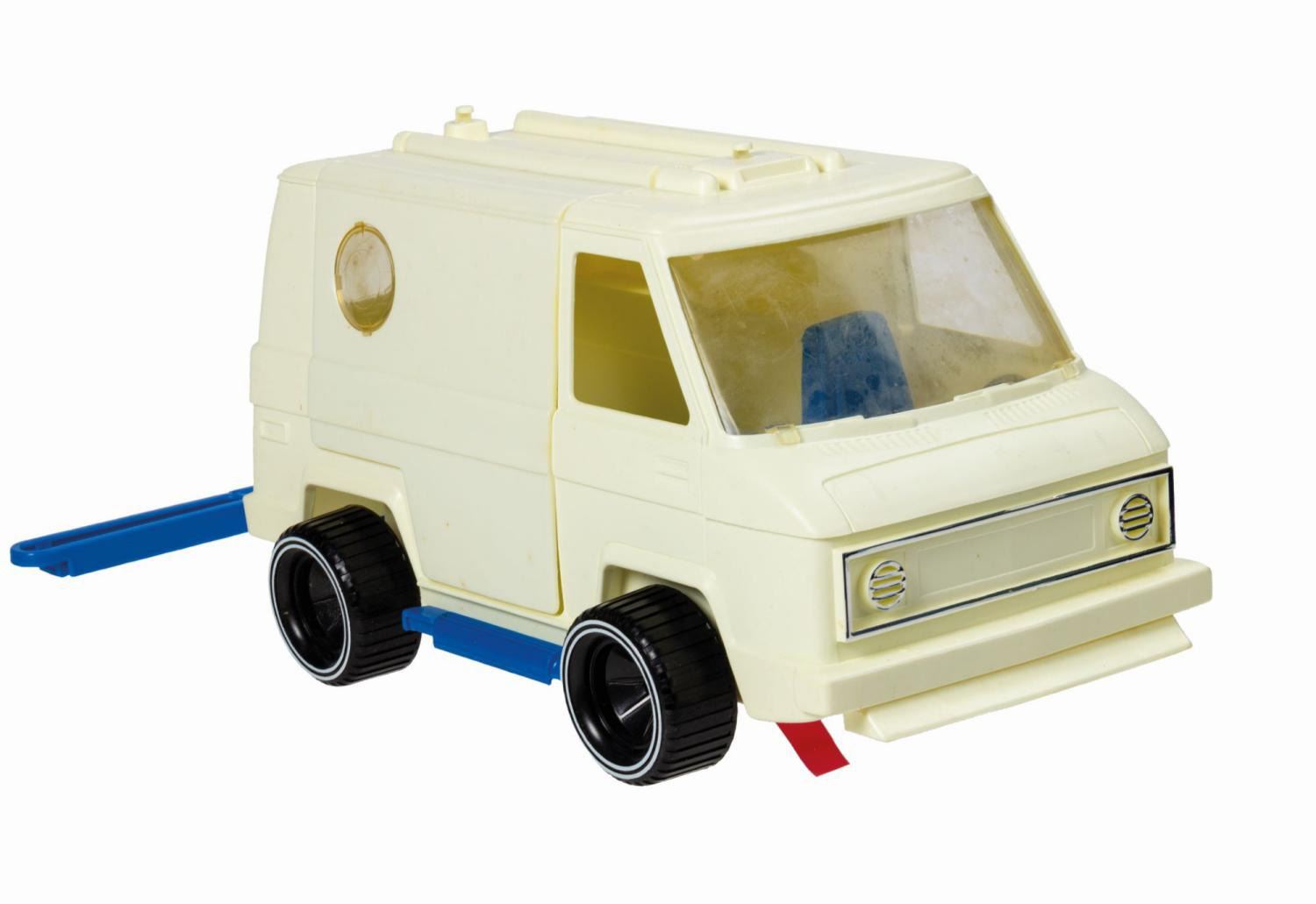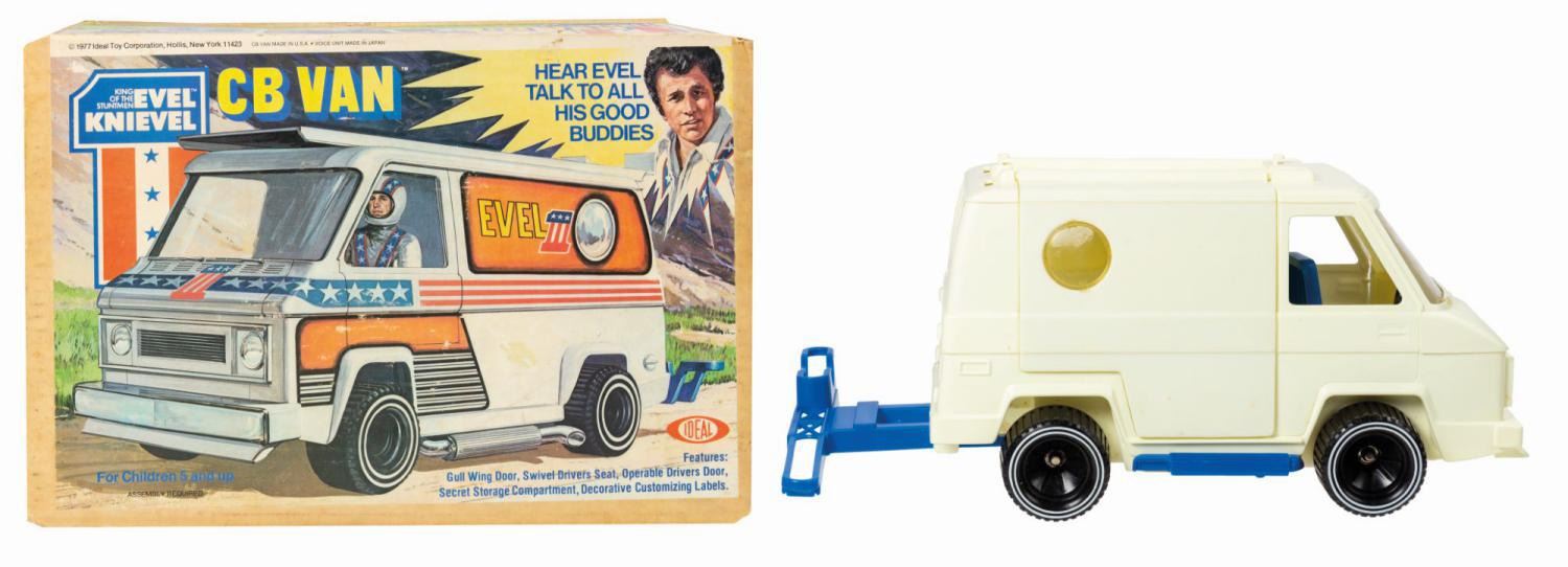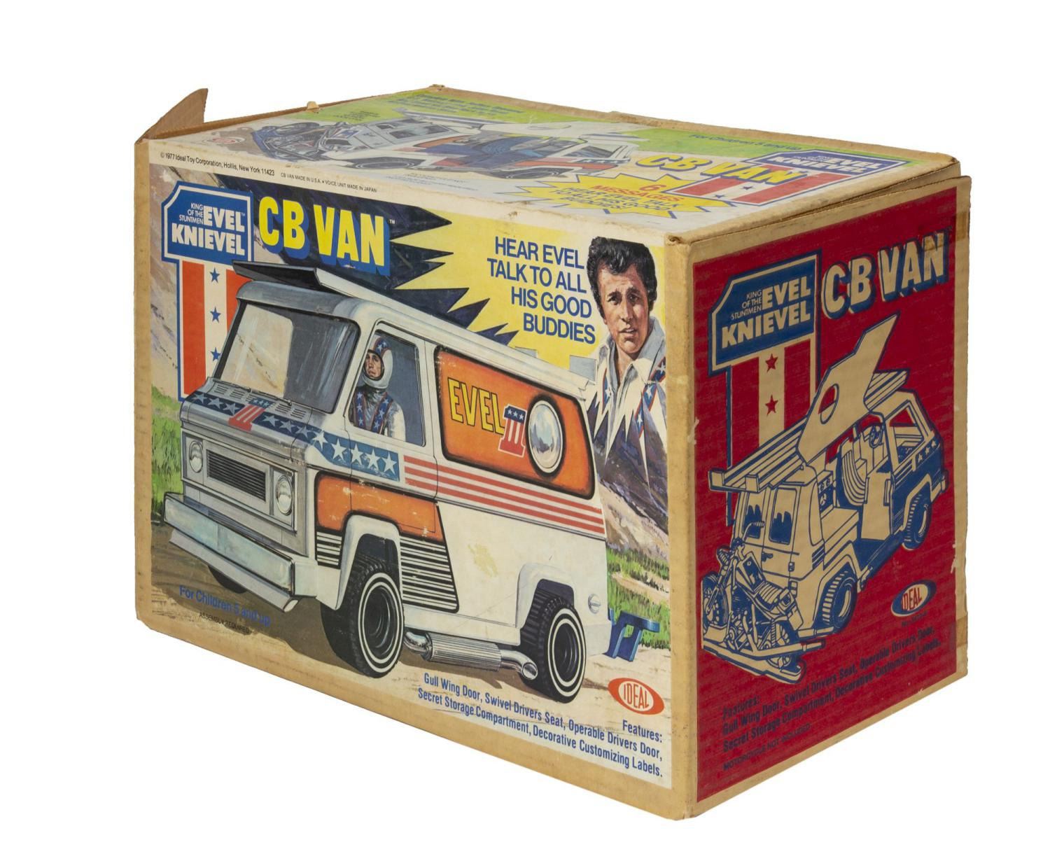 (Ideal, 1977) A rare vintage Evel Knievel CB van manufactured by Ideal. The plastic van includes a battery powered voice unit that plays CB radio messages in Knievel's own voice. As is often the case with these vans, the voice unit is currently non-functional. The set includes a motorcycle jump ramp that stows on the top of the van. Measuring 9.75"x14" and 7.5" deep, the original box is in very good condition. It exhibits some minor surface loss and soiling to the applique labels with tape staining, spot surface loss, cracking, and browning from age to the cardboard. The van exhibits some spot staining to the plastic from age and clouding to the windshield. All other components are as-new.