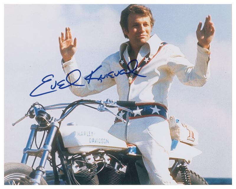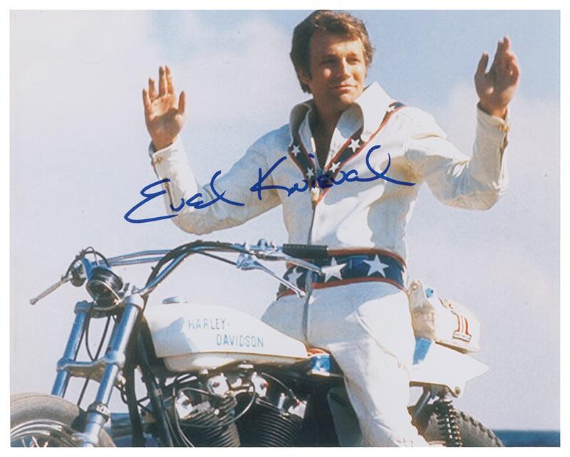 Two identical color glossy 10 x 8 photos of Knievel atop his Harley-Davidson, each signed in blue felt tip. In fine condition.