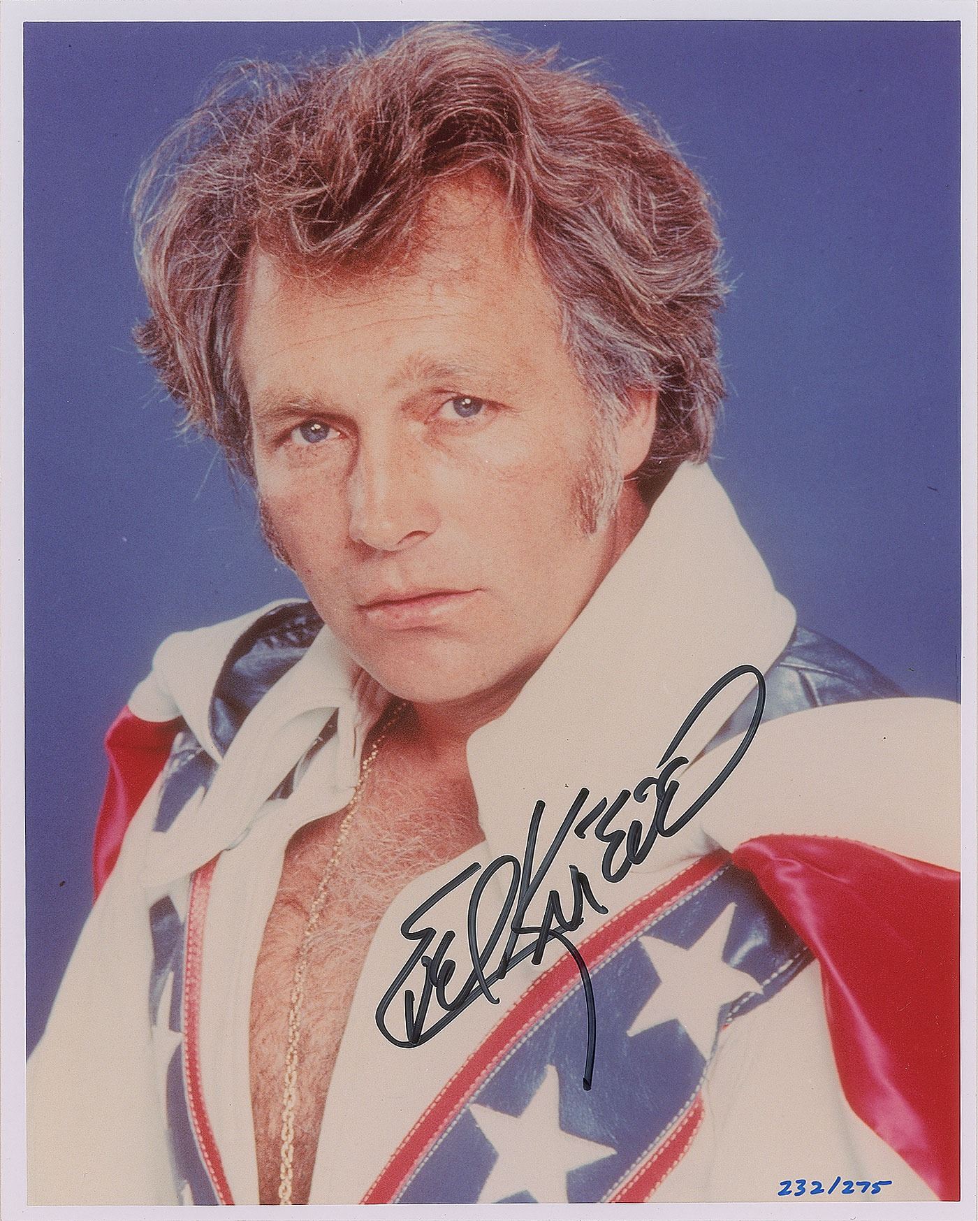 Limited edition color glossy 8 x 10 photo of Evel Knievel wearing his iconic patriotic jumpsuit, numbered 232/275, signed in black felt tip. In very fine condition.