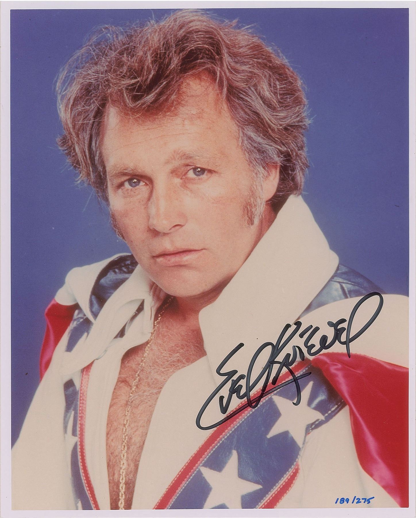 Limited edition color glossy 8 x 10 photo of Evel Knievel wearing his iconic patriotic jumpsuit, numbered 189/275, signed in black felt tip. In fine condition.
