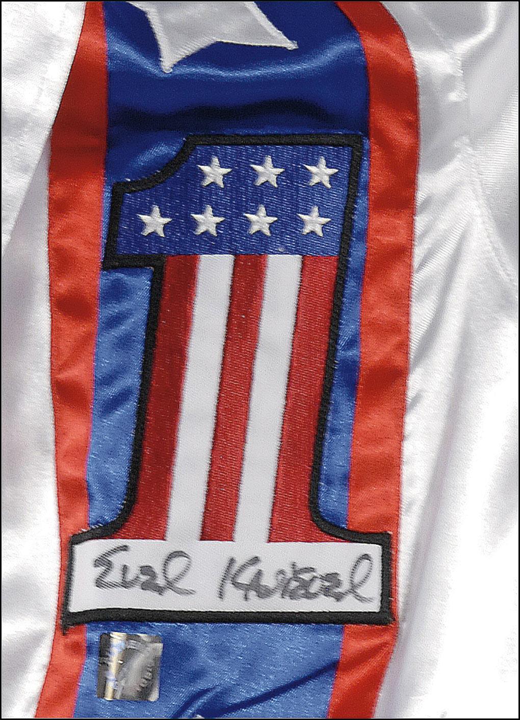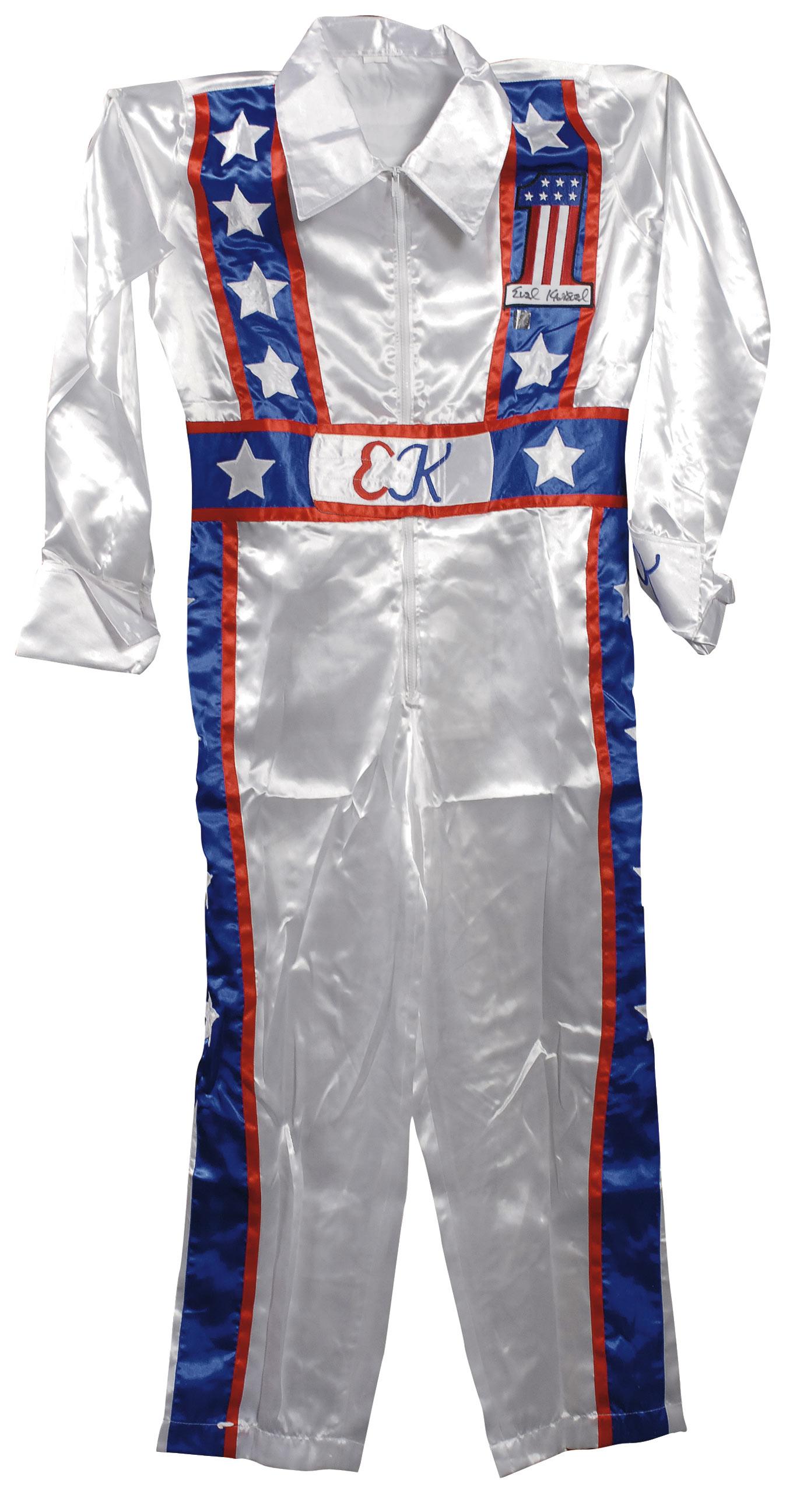 Red, white, and blue silk jumpsuit, bearing a red, white, and blue star-spangled number 1 sewn on the left breast, signed at the bottom of the number in black felt tip by Knievel. Accompanied by a photo taken at time of private signing. In very fine condition.