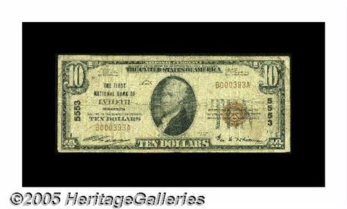 <B>Eveleth, MN</B></I> - $10 1929 Ty. 1 <B>The First NB</B></I> Ch. # 5553<BR>A <B>Very Good-Fine</B></I> from St. Louis County. The census from here in the 1929 series now stands at 12.