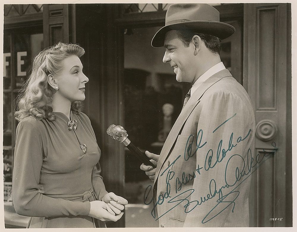 Glossy 9.5 x 7.5 photo of Ankers and Lon Chaney, Jr., in a scene from The Wolfman, signed and inscribed in black felt tip “To Al—God bless & Aloha, Evelyn Ankers.” Some scattered light creases, including one to lower right corner, otherwise fine condition.