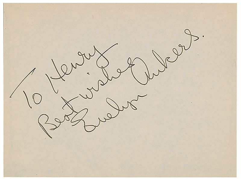 Actress (1918-1985) nicknamed ‘Queen of the Screamers’ for her numerous horror film roles. Vintage fountain pen signature and inscription, “To Henry, Best wishes, Evelyn Ankers,” on an off-white 6.5 x 5 sheet nicely mounted to a heavier sheet to an overall size of 8 x 9. In fine condition.