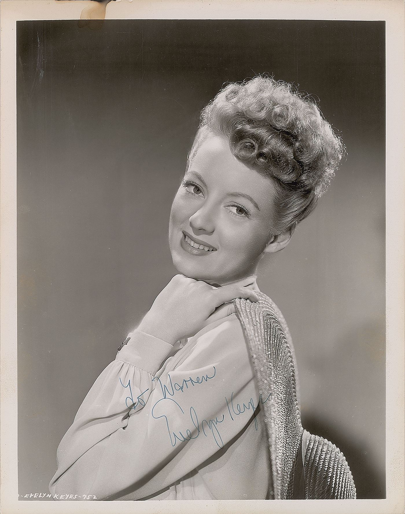 American film actress (1916–2008) who is best known for her role as Suellen O'Hara in the film Gone With the Wind. Vintage glossy 8 x 10.25 studio portrait of Keyes looking over her shoulder in profile, signed and inscribed in fountain pen, "To Warren, Evelyn Keyes.” In fine condition, with a stain in the top border.