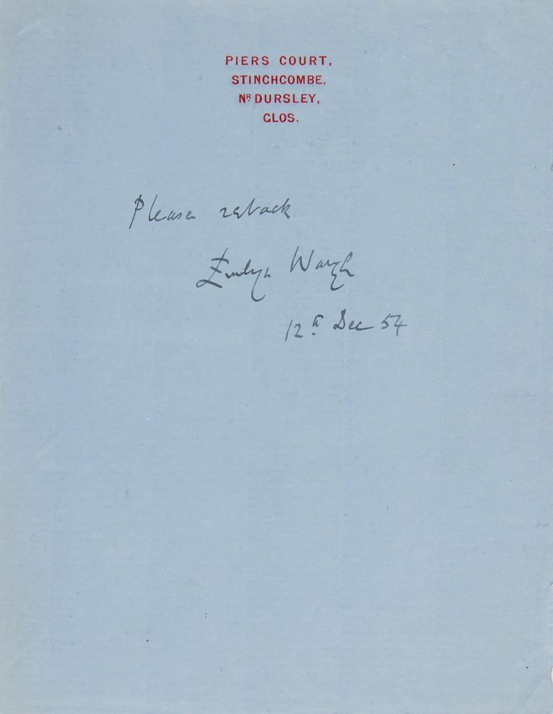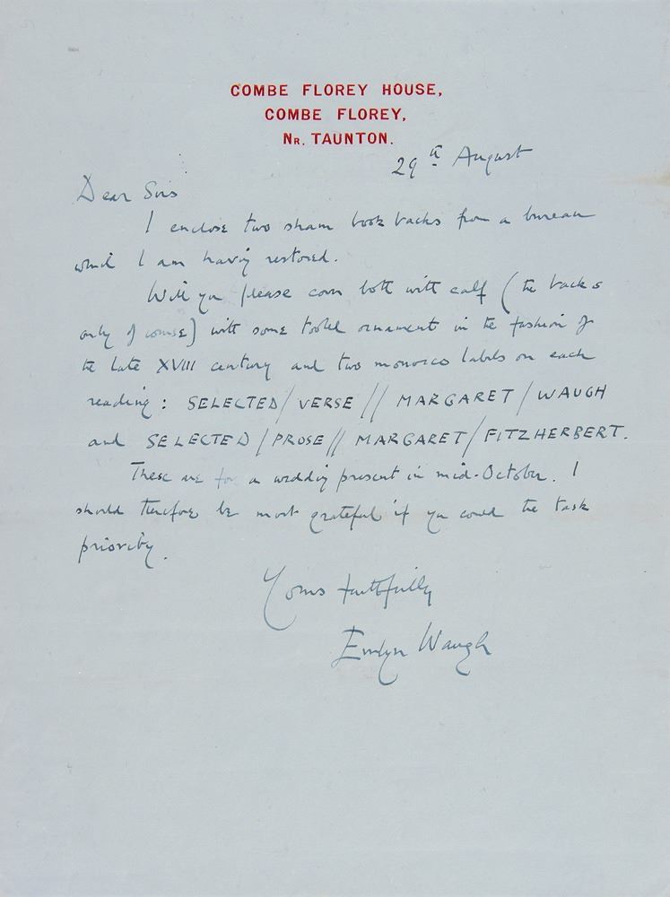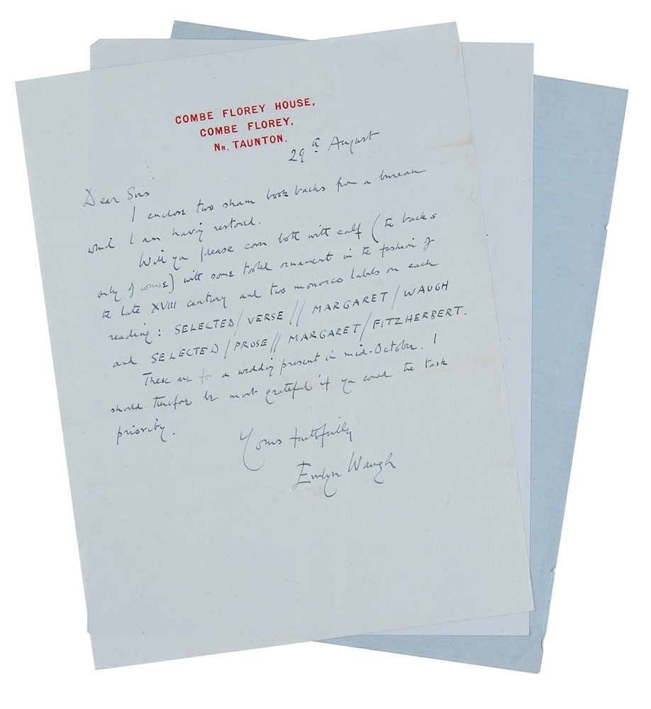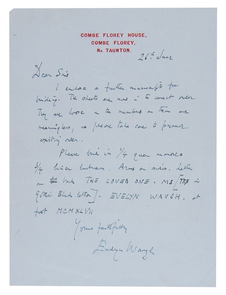 Two ALSs from acclaimed English novelist Evelyn Waugh to the esteemed London-based bookbinders Sangorski & Sutcliffe, both one page, penned on her personal 6 x 8 Combe Florey House letterhead. The first handwritten letter, June 26 [1947], in part: "I enclose a further manuscript for binding. The sheets are now in the correct order. They are loose & the numbers on them are meaningless…Please bind in ¼ green morocco ¾ linen…Arms on sides. Letter on back THE LOVED ONE. MS…EVELYN WAUGH…MCMXLVII"; and the second letter, August 29 [no year], in part: "I enclose two sham book backs from a bureau which I am having restored. Will you please cover both with calf…and two morocco labels on each reading: SELECTED / VERSE // MARGARET / WAUGH and SELECTED / PROSE // MARGARET / FITZHERBERT. These are for a wedding present in mid-October. I should therefore be most grateful if you could [make] the task priority." Also included is an ink signature, "Please reback, Evelyn Waugh, 12th Dec 54," on a sheet of her personal 6 x 8 Piers Court stationery. In overall fine condition.