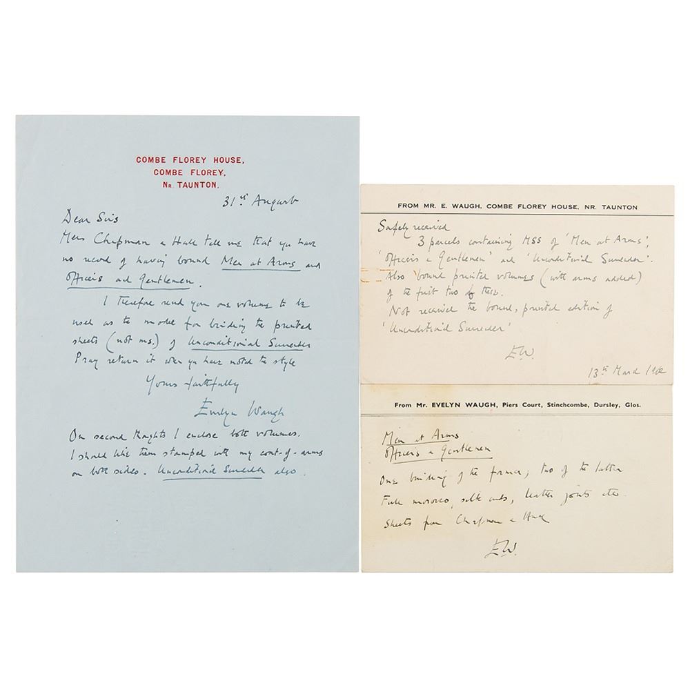 Three ALSs by Waugh, all concerning the fine binding of his works by Sangorski & Sutcliffe: an ALS signed "Evelyn Waugh," one page, Combe Florey House letterhead, August 31, in part: "Mess. Chapman & Hall tell me that you have no record of having bound Men at Arms and Officers and Gentlemen. I therefore send you one volume to be used as the model for binding the printed sheets (not MS) of Unconditional Surrender…On second thought I enclose both volumes. I shall like them stamped with my coat-of-arms on both sides"; an ALS signed "E.W." on a personal Combe Florey House correspondence card, in part: "Safely received, 3 parcels containing MSS of 'Men at Arms,' 'Officers & Gentlemen,' and 'Unconditional Surrender.' Also bound printed volumes (with arms added) of the first two of these. Not received the bound printed edition of 'Unconditional Surrender"; and an ALS signed "E.W." on a personal Piers Court correspondence card, in part: "Men at Arms, Officers & Gentlemen: one binding of the former; two of the latter. Full morocco, silk ends, leather joints etc." In fine condition. Accompanied by a retained carbon copy of one of Sangorski & Sutcliffe's replies to Waugh, regarding the binding of Men at Arms, Officers and Gentlemen, and Unconditional Surrender.
