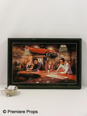Marilyn Monroe flirts with Elvis Presley while James Dean & Humphrey Bogart trade jokes and stories at Rick's Cafe. This is a framed light up with electrical cord, color photo. (approx. 18 1/2" x 13")