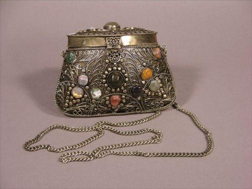 Evening Bag embellished with 20 stones, two are missing otherwise very good condition. 6 inches wide X 4 inches tall.