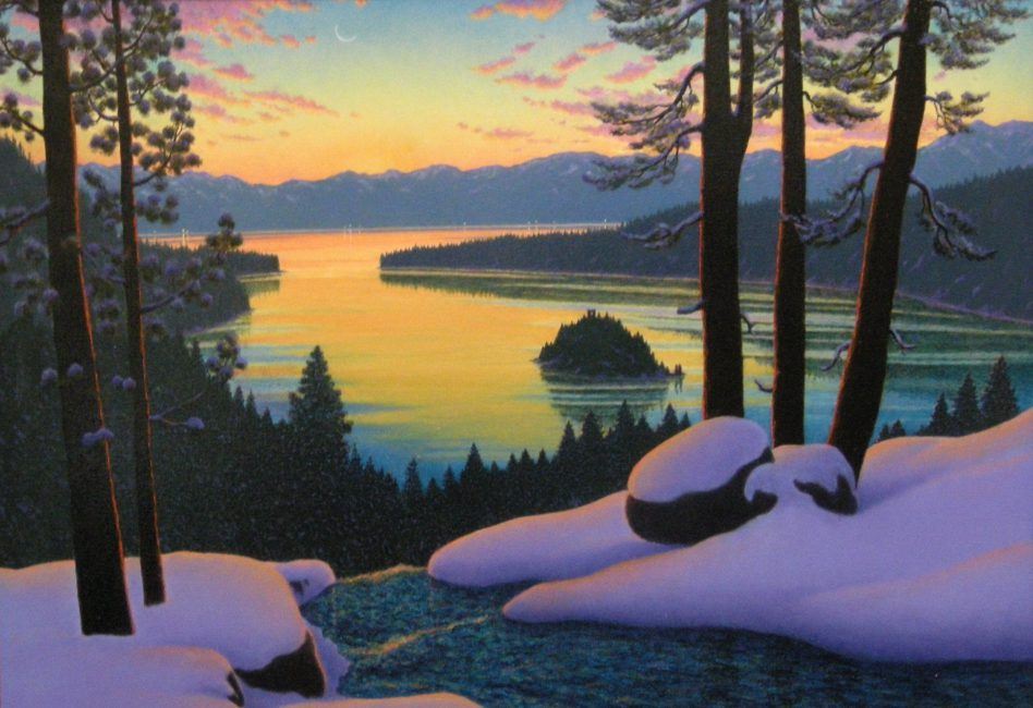 Evening Colors - Emerald Bay by Bill Jewell shows Emerald Bay at sunset. This piece is a framed original oil on canvas with the dimensions of 36"x 46".