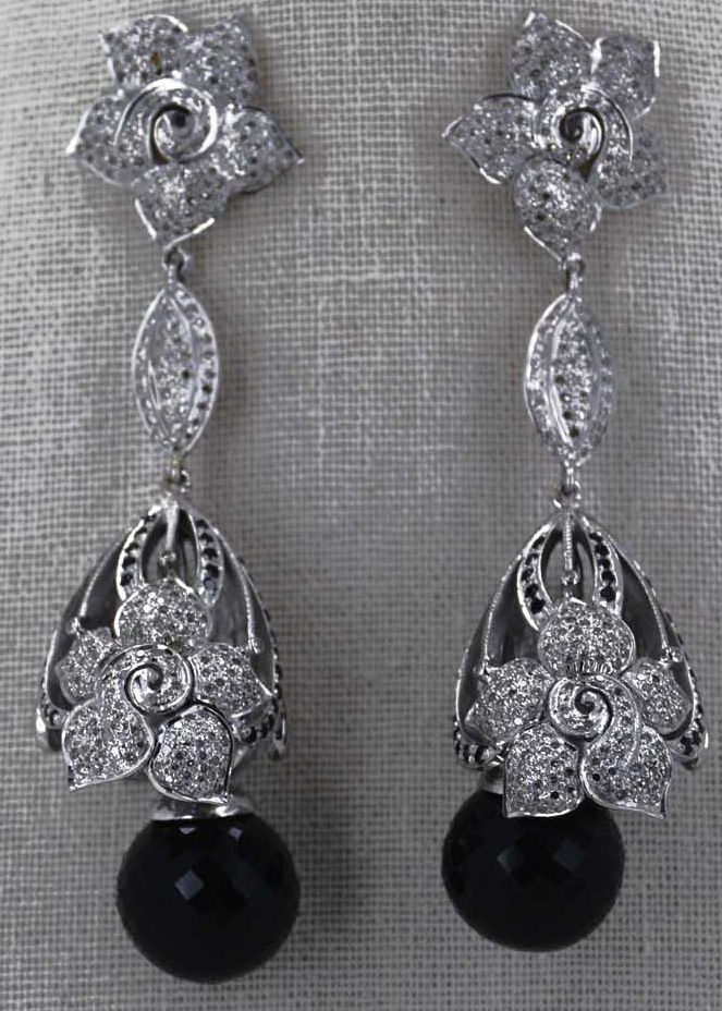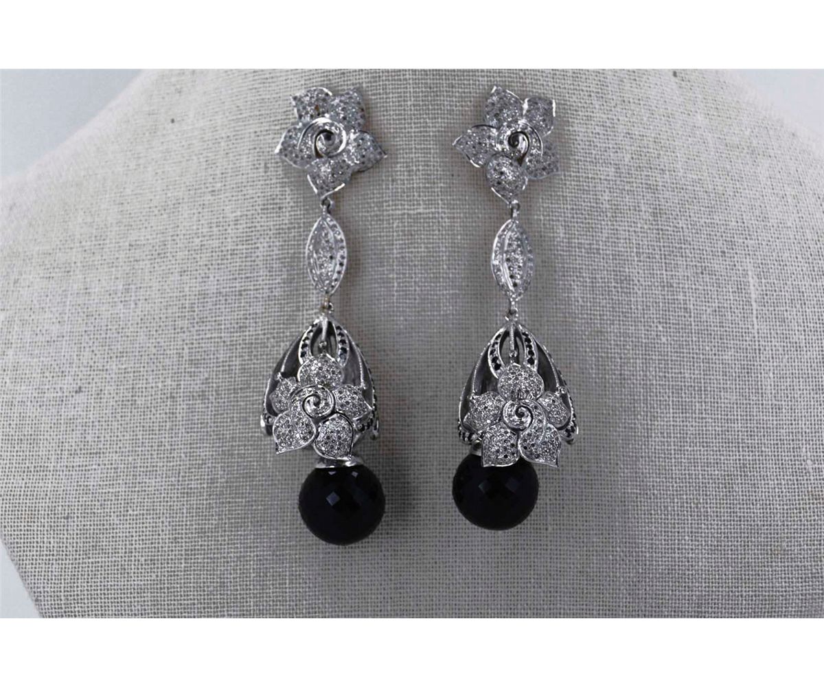 3.40cttw Approx Round White Diamond, Big Drop down Round Onyx w/ Round Onyx Accents, Flower Design post backs, 40.00 Approx grams of Gold Silver Mix
