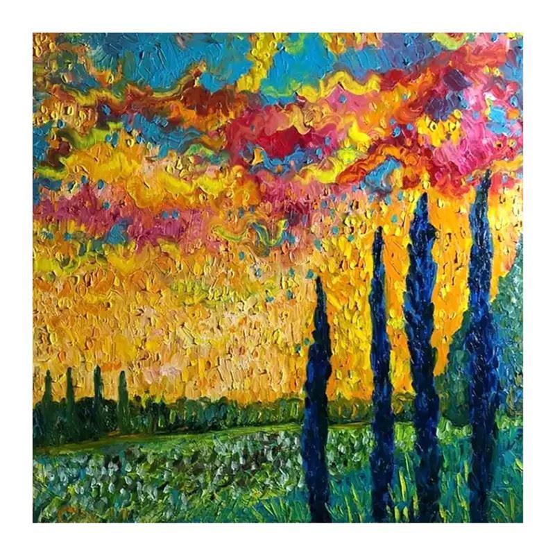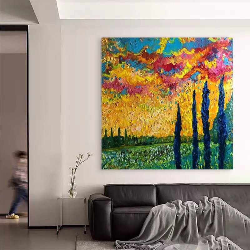 Fiery gold and rose clouds swirl across the sky while deep blue trees stand still beneath, gazing into the burning evening light. Dimensions: 24 x 24 inches.