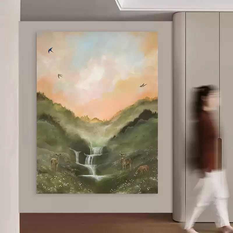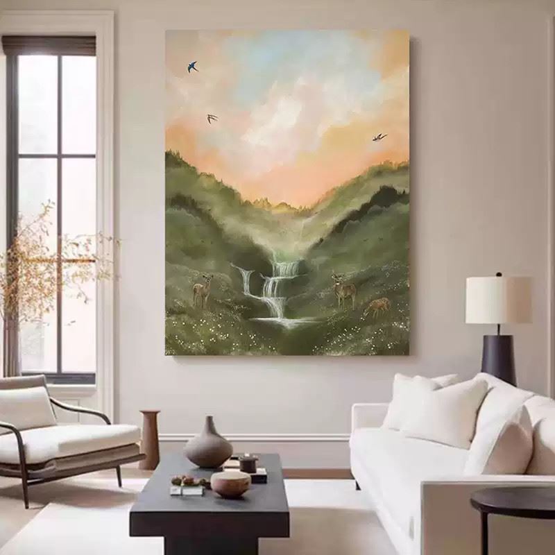 This painting depicts a serene and tranquil valley scene, with a waterfall cascading down the mountainside and fresh mist in the air, surrounded by lush green vegetation. A few deer stand leisurely on the grass, while distant birds soar freely in the sky, bringing life to the painting. The soft hues of the scene, with the warm glow of the setting sun coloring the mountains and stream, express the natural tranquility and harmony of the environment. Dimensions: 24 x 31 inches.