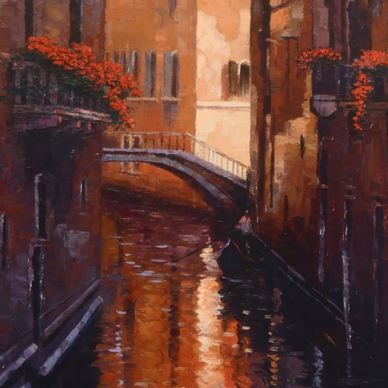 "Evening Shadows (Venice)" is a limited edition texturized giclee on board by Howard Behrens (1933-2014), numbered and bears the artist's official signature. A texturized giclee is a proprietary medium where a mold is made from the original oil painting as a basis for the giclee. Includes Certificate of Authenticity. Measures approx. 24" x 32" (image).