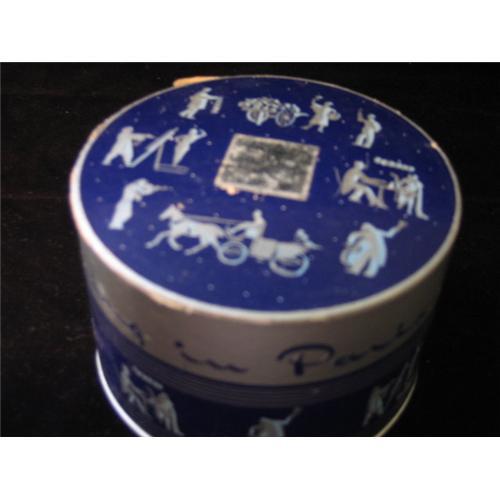 Lovely box of Evening in Paris bath powder (still almost full) by Bourjois. The box is covered with silver and blue paper, with small figures engaged in various activities on the lid and around the sides. The puff appears to have never been used--it is very clean but for the dusting of loose powder. It is made of velvet and satin, with "Evening in Paris Bourjois" on the satin section. There is a little wear around the rim of the top, and a few little spots on the top where the blue has worn off. Other than these, it is in excellent condition.