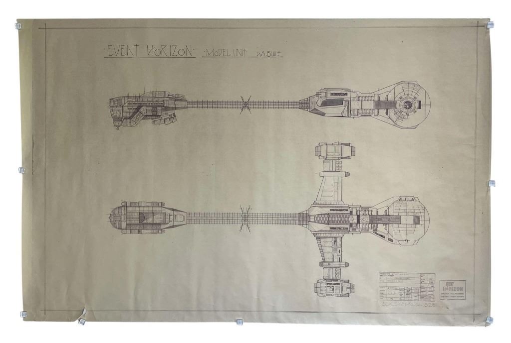 Original production blueprint for the ship model used on the Paul W. S. Anderson directed science fiction horror film 'Event Horizon' (1997), which follows a crew of astronauts sent on a rescue mission after a missing spaceship, the Event Horizon, spontaneously appears in orbit around Neptune, only to discover that a sinister force has come back with it.