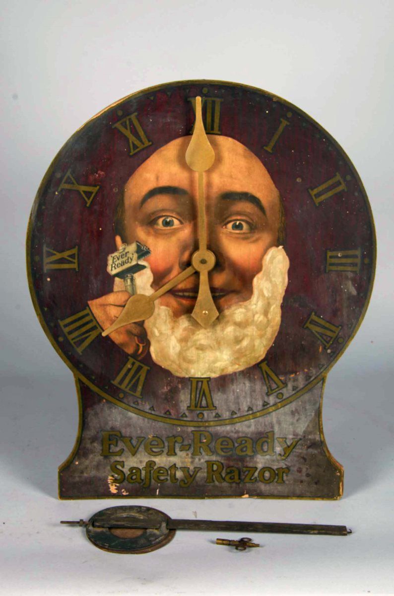Ever-Ready Safety Razor Blades Wood Backed wind-up advertising clock with key. Slogan "with 12 radio Blades $1 complete" round tin sign on pendulum, circa 1919. Condition (Fair). Size 18" x 22" h x 4" d