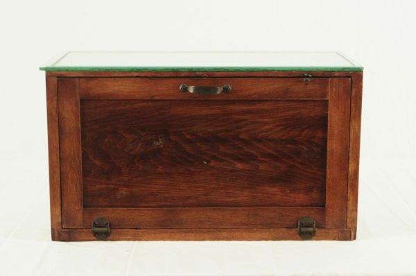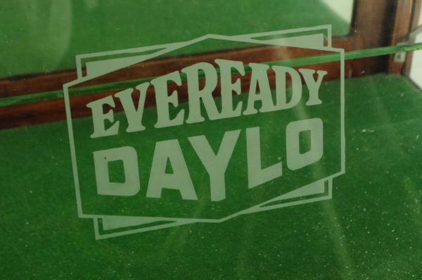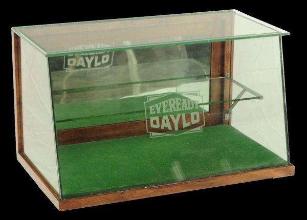 Original Eveready Daylo etched glass slant front countertop flashlight display case. Measures 20-1/2" W x 12-1/2" D x 11-3/4" H.