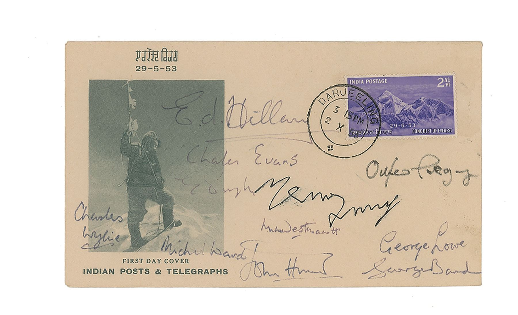 Indian FDC with a cachet honoring the first ascent of Mount Everest on May 29, 1953, signed in ink or felt tip by 11 members of the British Mount Everest expedition: Edmund Hillary, Tenzing Norgay, Charles Evans, Charles Wylie, Griffith Pugh, Alfred Gregory, Michael Westmacott, George Lowe, George Band, Michael Ward, and John Hunt. In fine condition.