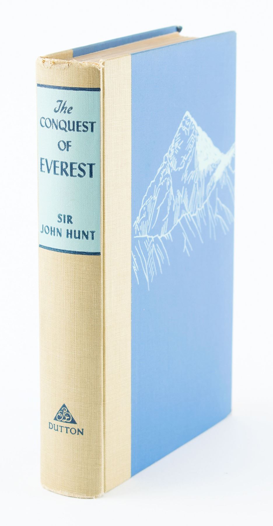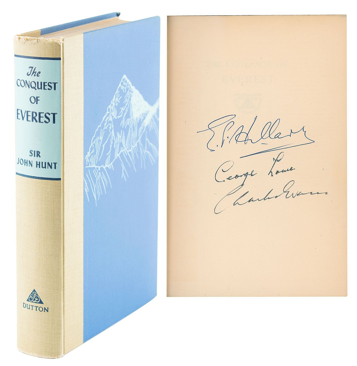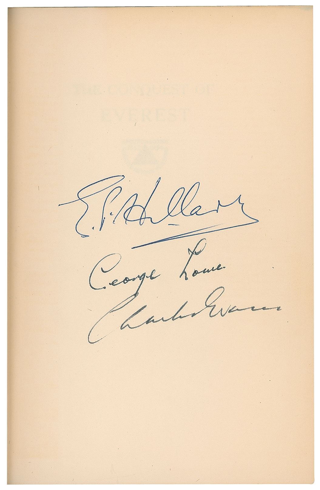 Signed book: The Conquest of Everest. First edition. NY: E. P. Dutton & Company, Inc., 1954. Hardcover, 6 x 8.75, 300 pages. Signed on the first free end page in ballpoint, "E. P. Hillary," and in black ink, "George Lowe" and "Charles Evans." In fine condition, with some fraying to the head of the spine.