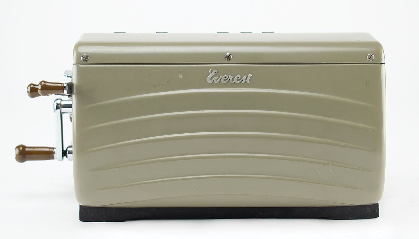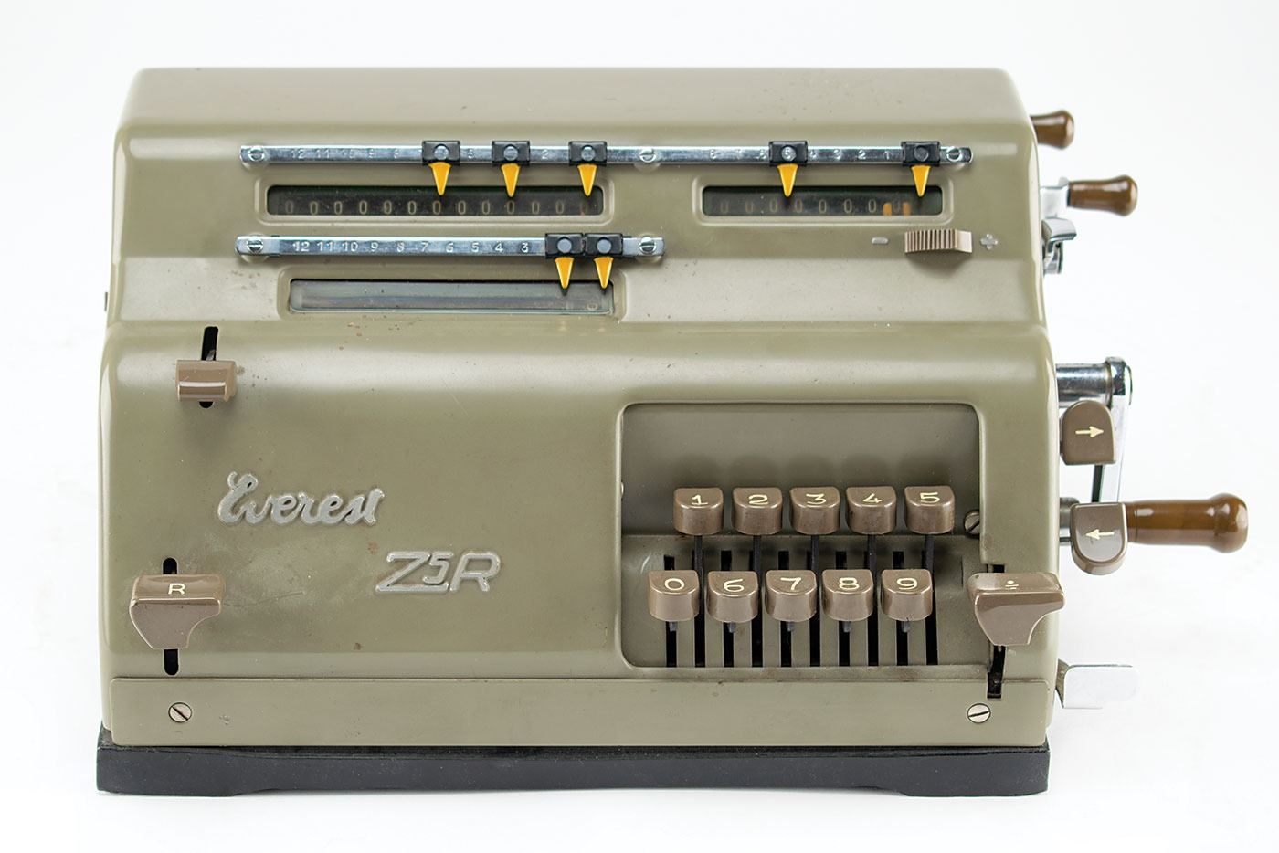 Circa 1958–1962 Everest Z5R pinwheel mechanical calculator made in Italy, measuring approximately 13˝ x 6.5˝ x 7˝, with the ability to perform the four basic arithmetic operations: addition, subtraction, multiplication, and division. In fine condition, with some staining to the vinyl cover.