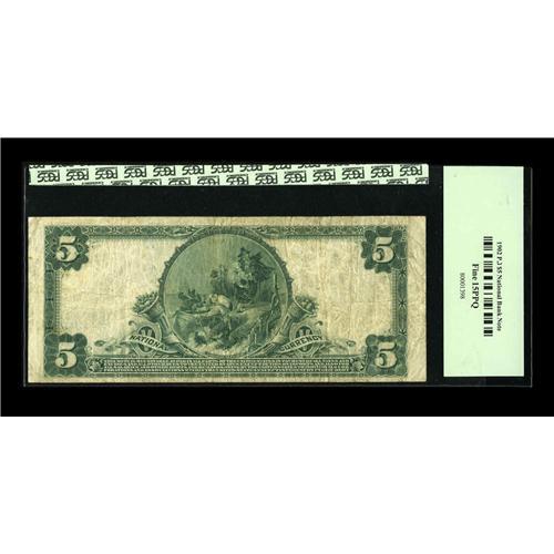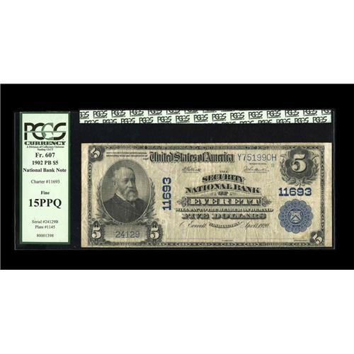 <B>Everett, WA</B></I> - $5 1902 Plain Back Fr. 607 <B>The Security NB </B></I> Ch. # 11693<BR>This institution issued under three titles, with all of its large size bearing this, the first nomenclature. While the margins are fully adequate, the signatures have faded on this <B>PCGS Fine 15PPQ</B></I> note that we expect will be in the range of...