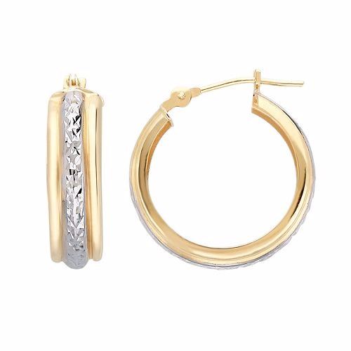 Dress up any ensemble with these dazzling 10k yellow and white gold hoops. Earring Details:Length: .7 inBackings: click-itMetal: 10k yellow gold, 10k white goldFeatures: diamond-cut details