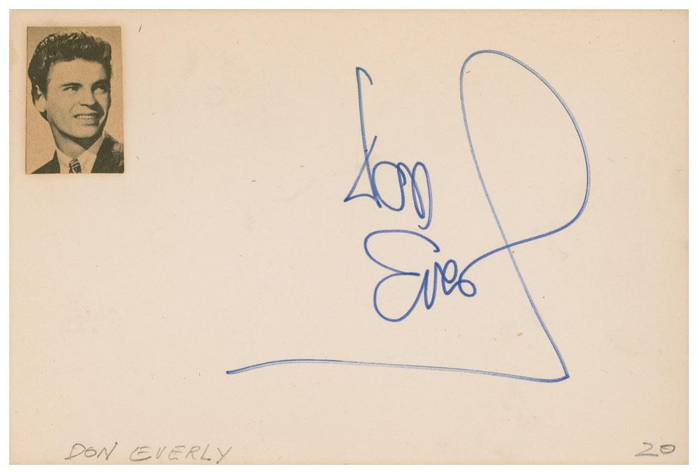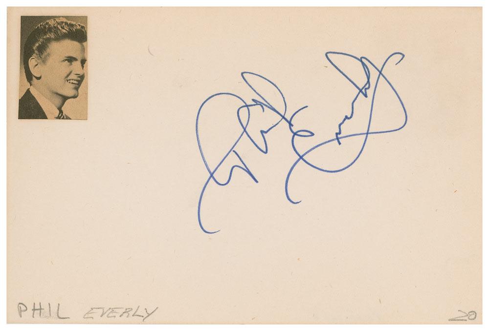 Felt tip signatures of Phil and Don Everly on individual off-white 6 x 4 cards, each with an affixed clipped photo and pencil collector’s notations. In fine condition, with some mild toning to edges.