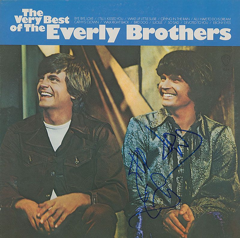 The Very Best of the Everly Brothers album signed on the front cover in blue felt tip by Phil and Don Everly. In fine condition, with a bit of scattered light edge wear. The record is not included.