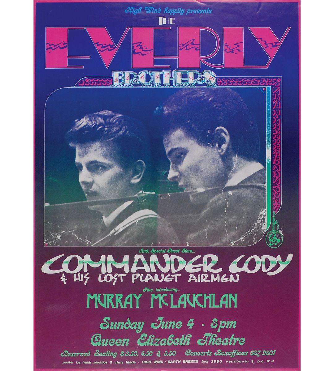 Poster for the Everly Brothers show at Queen Elizabeth Theatre on June 4, 1972, 17 x 23.5, featuring an older image of the duo in the center. In fine condition.