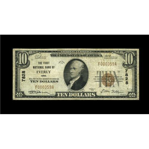 <B>Everly, IA</B></I> - $10 1929 Ty. 1 <B>The First NB</B></I> Ch. # 7828<BR>This was the only federally chartered issuer in town and failed during the summer of 1933. This bank is quite simply rare in small size, with the latest census showing just four examples in either of the two denominations it issued in Type 1. The wait for another example may be quite long and frustrating if you miss this opportunity. Tonight's offering is a solid <B>Fine</B></I> and should sell for roughly...