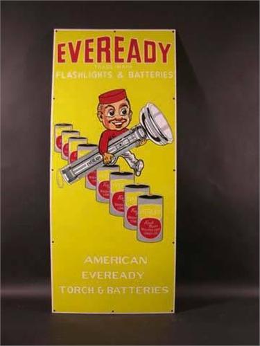 Sign, porcelain Everready Flashlights & Batteries sign. 1 sided, 5 color, very rare, 18"x42", mint cond.
