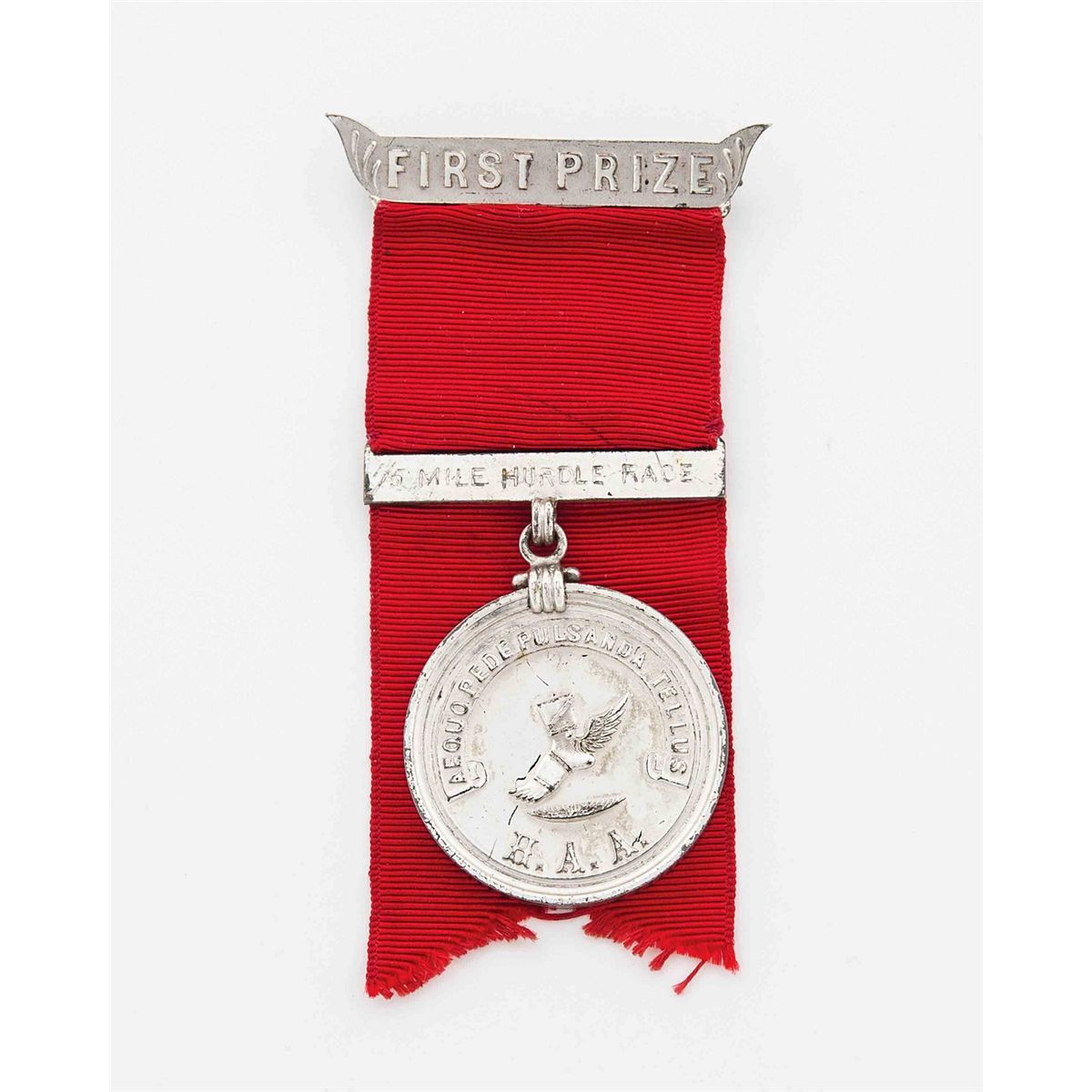 Harvard Athletic Association first prize medal presented to Evert Jansen Wendell in 1882. Medal measures approximately 1.25? in diameter, with the HAA [Harvard Athletic Association] emblem on the front below its Latin motto, and is engraved on the reverse, “E. J. Wendell 82, 57 sec.” Medal is attached by a loop to a ribbon and crossbar, with “1/5 mile hurdle race,” engraved on the crossbar, with the upper cross bar reading, “First Prize.” Condition is extra fine.
