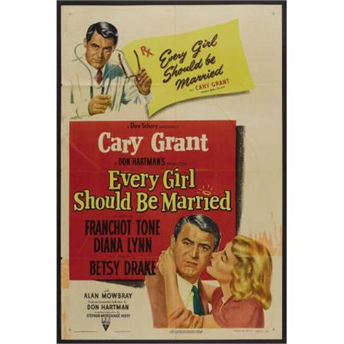 <B>Every Girl Should Be Married (RKO, 1948).</B></I> One Sheet (27" X 41"). Comedy. Starring Cary Grant, Franchot Tone, Diana Lynn, Betsy Drake, Alan Mowbray, Elisabeth Risdon, Richard Gaines and Harry Hayden. Directed by Don Hartman. A number of staple holes and pinholes. Staining in the left border and the lower right field. Tiny cross fold separations and small wear holes on the lower fold lines. Left edge creases from misfolding, and scattered light scratches. Good color and two images of Grant. Very Good/Fine.<BR><BR><b>Shipping:</b> Flat Material, Small (<a target="_blank" href="http://www.heritageauctions.com/common/shipping.php">view shipping information</a>)