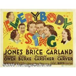 <B>Everybody Sing (MGM, 1938)</B></I> Title Lobby Card (11" X 14"). The great title card for this MGM musical pictures all the stars singing. The slight story concerns the trials of a headstrong daughter who is expelled from school for singing swing music. Shown are Fanny Brice, Allan Jones, and Judy Garland. Pinholes, edge tears, very slight soiling and very small corner creases. Beautiful bright vivid colors on this nice clean title card. Very Fine+.