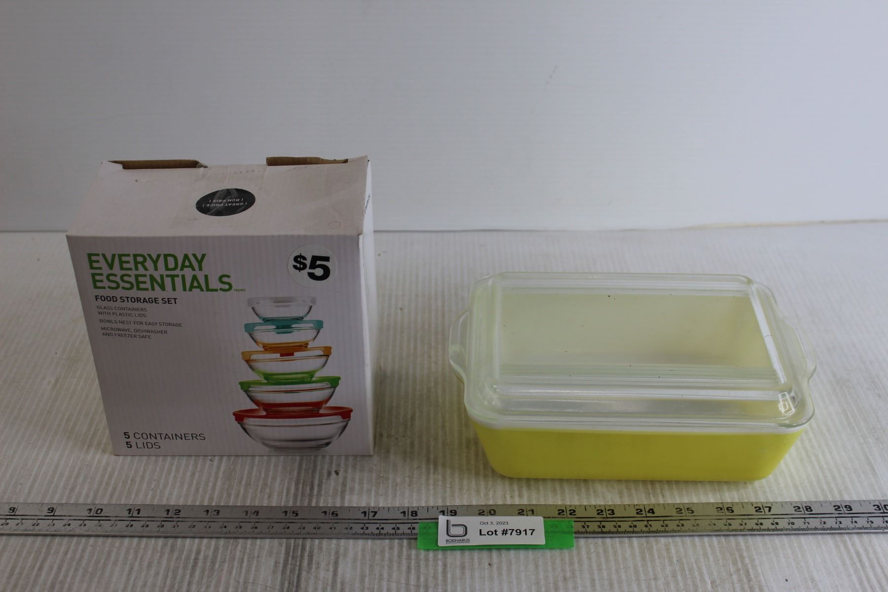 Everyday Essentials Food Storage Set - NIB, Pyrex Dish - Chip on Glass Top Handle