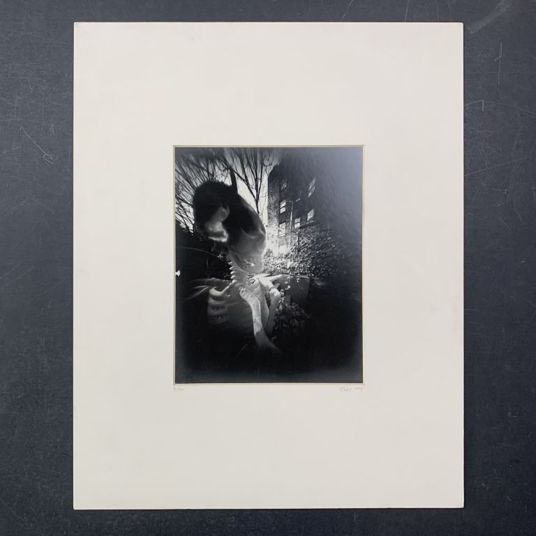Eves' "Skeleton" Limited Edition Photograph. A black and white photograph of a skeleton in the daylight. This piece is matted in off-white and signed and numbered 4/50 on the mat under the image. It is in excellent condition