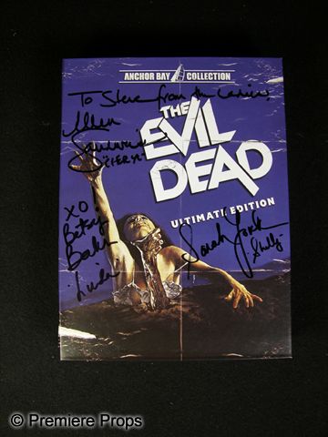 Evil Dead DVD Ultimate Edition from Anchor Bay, signed by stars Betsy Baker, Ellen Sandweiss and Sarah York in black felt pen. Each has added her character name. Sandweiss has personalized her signature. (7.5x6)