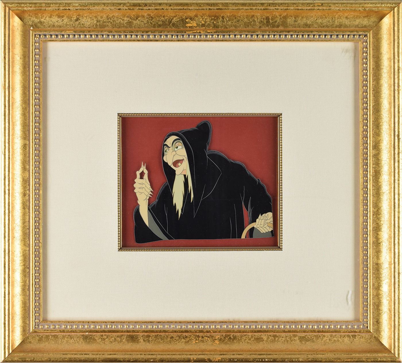 (Walt Disney Studios, 1937) Original production cel featuring the Evil Queen from Snow White and the Seven Dwarfs, showing the diabolical queen in her transformed state as a ghastly Witch, her left hand gripping the handle of an apple basket. Image measures 6.75 x 5.5, with a mat opening of 7.5 x 6.25. Matted and framed to an overall size of 19.25 x 17.25. In fine condition.