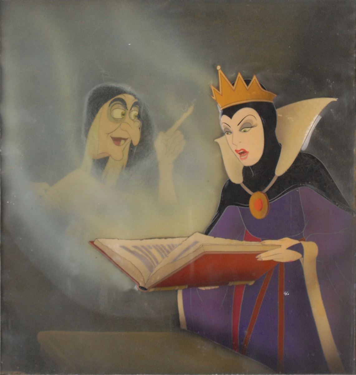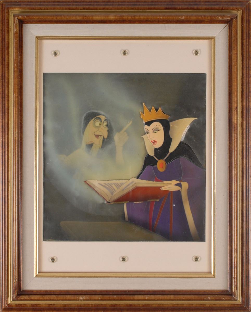 (Walt Disney Studios, 1937) Original production cels featuring two portrayals of the Evil Queen from Snow White and the Seven Dwarfs, showing the villainess perusing her book of spells as her metamorphosed form, the Wicked Witch or Old Hag, looks on from a mystical cloudy background. The cels have been trimmed to image and applied to an airbrushed background as prepared by Courvoisier Galleries for sale. Character images measure 8 x 9.25 and 5 x 4, with a mat opening of 10.75 x 11.25. This piece is also framed to an overall size of 17 x 21. The piece has the original Walt Disney Enterprises label on the reverse. In fine condition, with a bit of rippling to cels and some trivial scattered surface marks. An exceptionally rare example of this classic evil character in both of her forms and one of the most desirable of all Snow White cels.