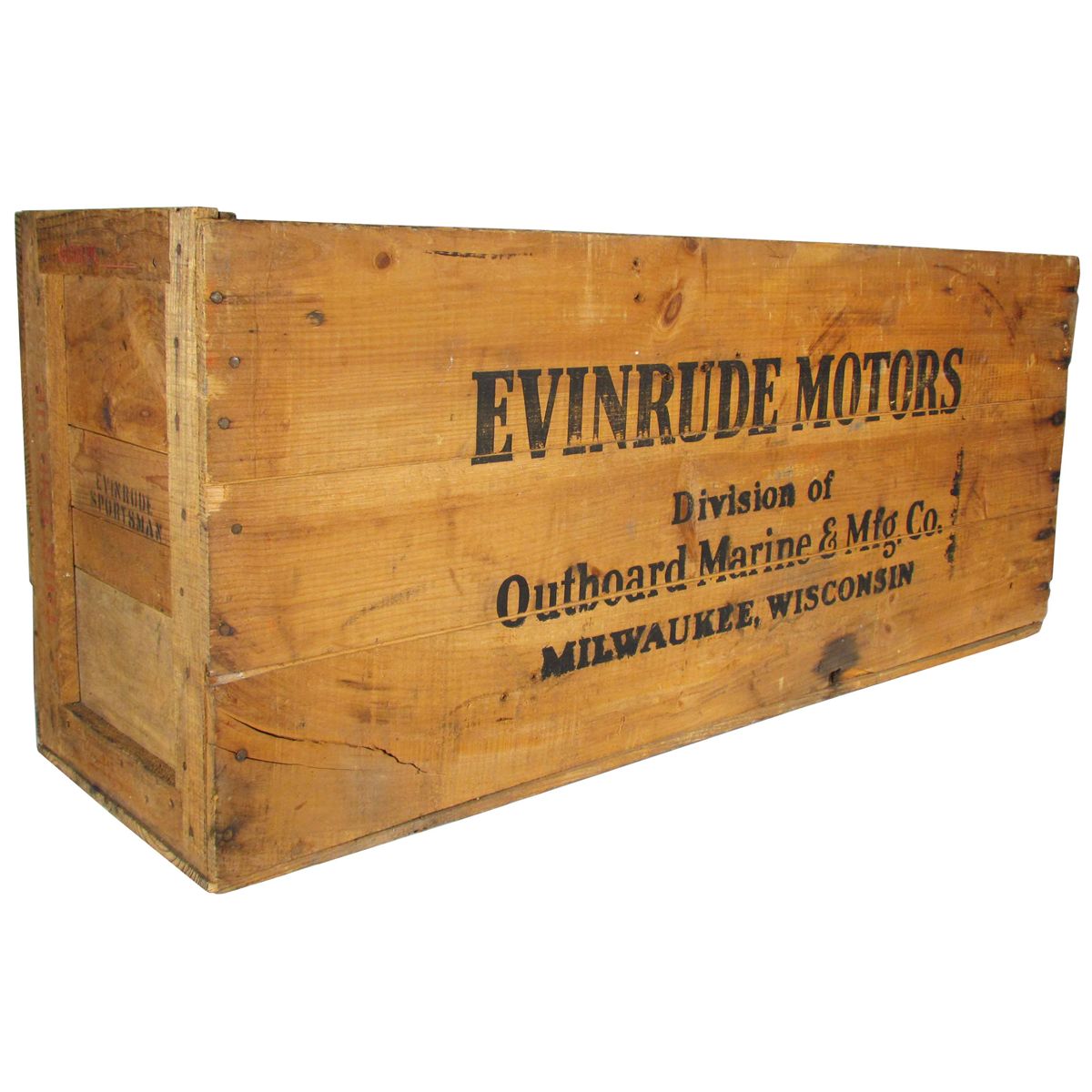 Evinrude Motors Wood Shipping Crate. Evinrude Sportsman Motor. Milwaukee, Wis. No lid, very good condition. 42 X 17 X 12 inches.