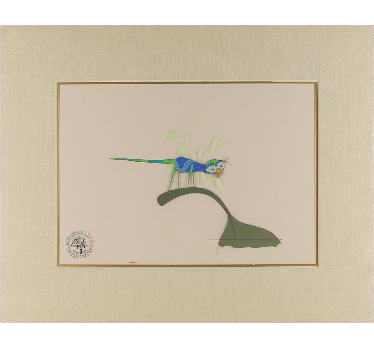 (Walt Disney Studios, 1977) Original production cel featuring Evinrude from The Rescuers. Image measures 10 x 6.5 and shows the dragonfly at the stern of his leaf boat, with a mat opening of 13.5 x 9.5. Mat dimensions are 20 x 16. Walt Disney Studios seal to lower left and certificate of authenticity included. In fine condition.