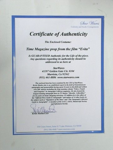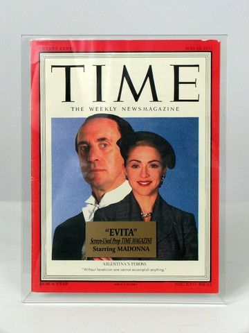 From the critically acclaimed hit musical feature "Evita" (1996), this is an actual screen used Time Magazine Prop with Madonna, in her role as Eva Peron on the cover. A wonderful and rare piece of Madonna and movie musical memorabilia. Comes in a custom plastic display stand, with special plaque. Also includes a COA from both Disney Studios and Star Wares. Approx 8.5" x 11".